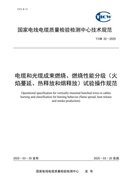 MORE>>國纜檢測發(fā)布電纜和光纜成束燃燒(熱釋放、煙釋放)性能試驗操作規(guī)范